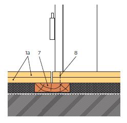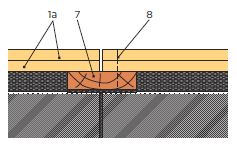 V případě přerušení podlahy v prostoru dveří se podlahové dílce podloží podkladním dřevěným trámkem šířky cca 70 mm, který je uložen na pružné vrstvě (např. mirelon tloušťky 2 mm) a připojen šrouby či sponkami (sponky s pryskyřicí) k podlahovým dílcům jen na jedné straně spáry. Doporučená šířka spáry mezi deskami: 5 mm.