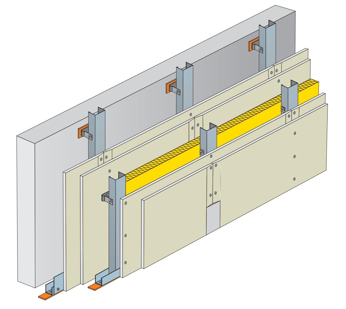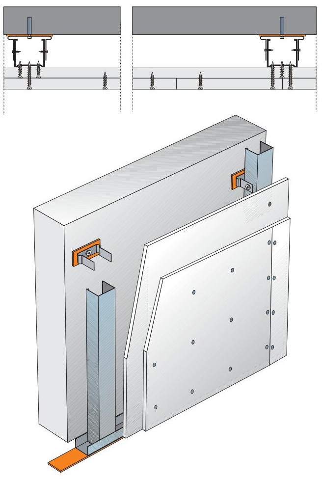 Alternativně lze tuto konstrukci aplikovat jako předsazenou stěnu na třmenech. Rozteč svislých R-CD profilů je pak 1 000 mm. Rozteč stavěcích třmenů je rovněž max. 1 000 mm.
