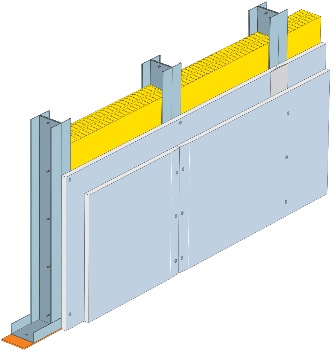 Opláštění je provedeno dvěma vrstvami desek Glasroc F Ridurit tloušťky 20 mm, desky jsou orientovány naležato. První vrstva opláštění je našroubována šrouby TN 212 v rozteči 200 mm do podkonstrukce. Sádrokartonové desky jsou montovány na těsný sraz bez nutnosti tmelení.