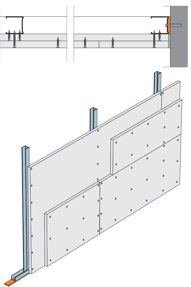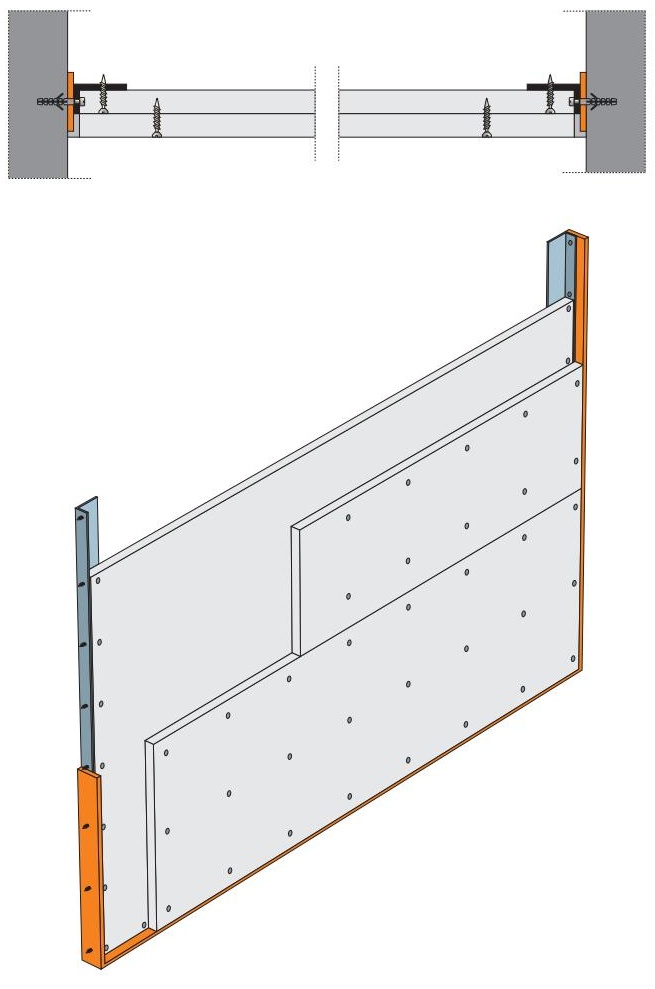 Maximální šířka šachtové stěny je v tomto případě 2 metry (délka desky). Jako obvodové profily jsou užity úhelníky z ocelového pozinkovaného plechu 40/20/1 mm (není v sortimentu Rigips) kotvené ke svislým nosným stěnám ocelovými hmoždinkami (např. DN6) po 500 mm. Desky jsou pnuty přes celou šířku bez svislých spár.