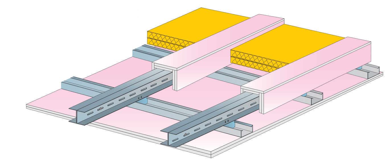 Samonosné podhledy jsou konstrukce, které nejsou závislé na stropní konstrukci. Těmito konstrukcemi je možné řešit i požární odolnost – více viz aktuální Katalog požárně odolných konstrukcí nebo Technické listy konstrukcí. Nosné profily jsou nasunuty do profilů R-UW (do rozponu 4 m) nebo profilů UW Max (do rozponu 6,8 m), které jsou k protilehlým nosným svislým konstrukcím upevněny vždy dvěma kotvícími prostředky nad sebou v rozteči 625 mm: