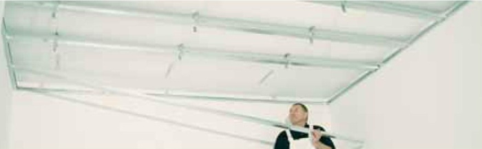 Zavěšený podhled na jednoúrovňovém křížovém roštu z profilů R-CD