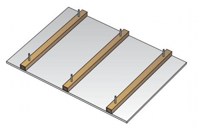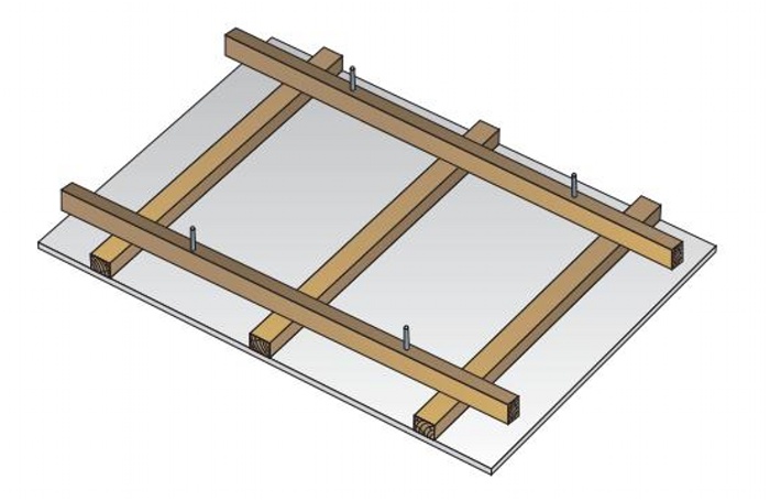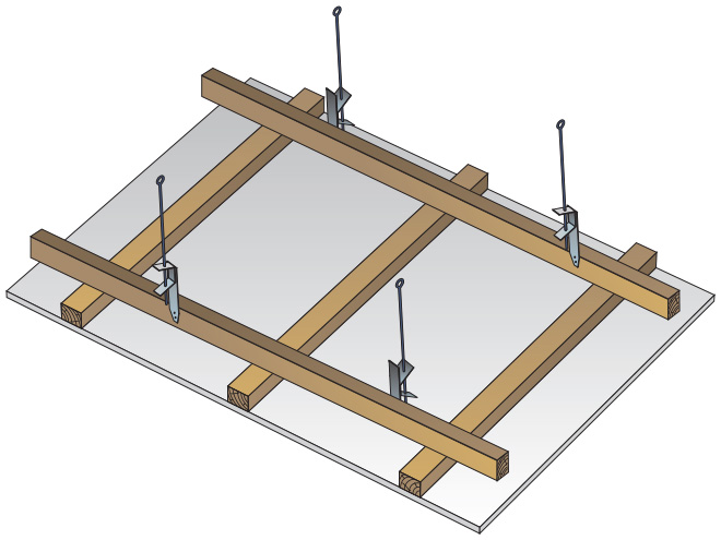 Montážní latě jsou k nosnému stropu připevněny prostřednictvím přímých závěsů, stavěcích třmenů nebo přímo do nosného stropu.