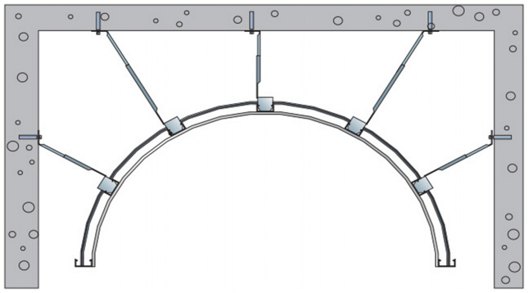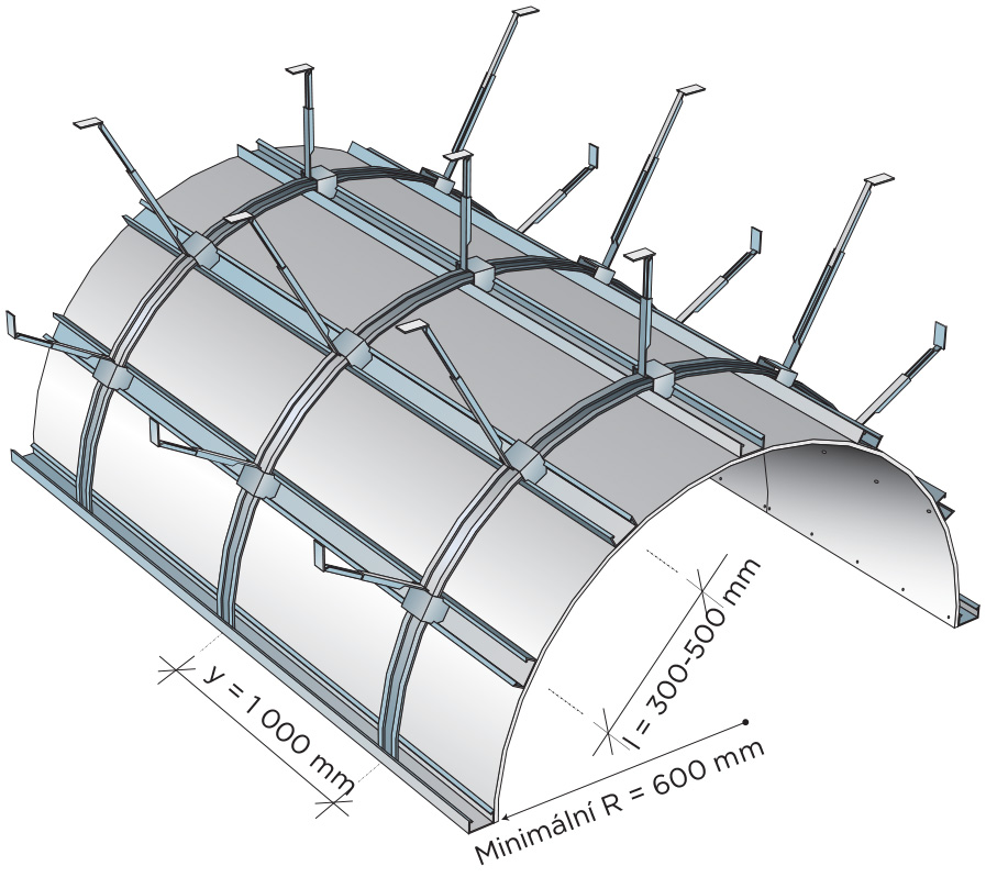 Tvar zaoblení se vytvoří pomocí ohnutých nosných profilů připevněných ke stropu (popřípadě stěně) prostřednictvím závěsů Nonius (nutná vzpěrná pevnost). Spolu se spodním dílem závěsu Nonius pro dřevo se k ohnutému nosnému profilu přišroubuje šrouby M6 x 16 i křížová spojka. Maximální rozteč ohebných nosných profilů je y = 1 000 mm. Po sestavení se na křížové spojky nasadí podélné profily R-CD. Rozteč profilů R-CD podélné osnovy je třeba přizpůsobit poloměru oblouku R.