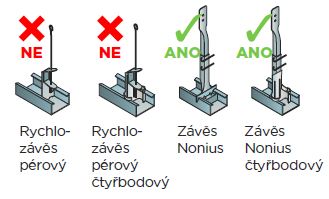 je nutno zavěsit pomocí závěsů systému Nonius, stavěcí třmen nebo přímý závěs s odpovídající antikorozní úpravou. Rošt nesmí být zavěšován na pérové závěsy z důvodu nebezpečí stykové koroze mezi pérem a závěsným drátem.