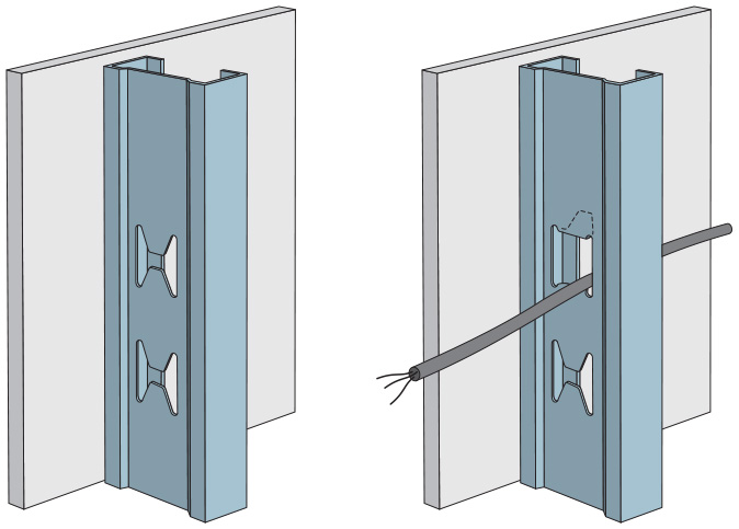 c) Není dovoleno, aby kabely ležely bezprostředně na ostré hraně plechu profilů. V případě dodatečného provádění otvorů přímo na stavbě je nutné ostré hrany vhodným způsobem ochránit.