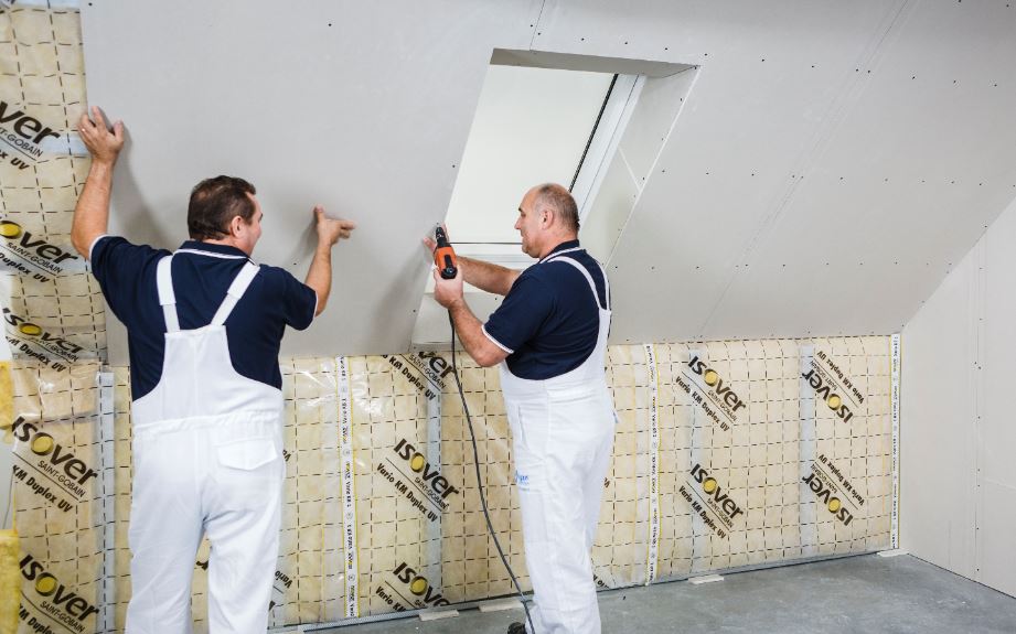 - Následně se vloží minerální izolace mezi krokve. Parozábrana se nalepí pomocí oboustranně lepicí pásky na R-CD profily.
