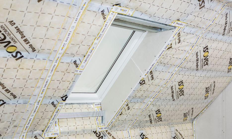 - Poté se aplikuje parozábrana – lze ji přilepit k terčům ze samolepicí fólie, které jsou na spodní přírubě krokvového nástavce.