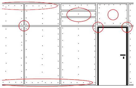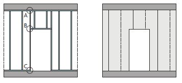 Svislé spáry mezi sádrokartonovými deskami se umístí vždy nad dveřním otvorem ve vzdálenosti alespoň 150 mm od bočního ostění zárubně. Není přípustné, aby spára vybíhala přímo z horního rohu zárubně. Svislé spáry sousedních sádrokartonových desek jsou připevněny ke dvěma zkráceným R-CW profilům, umístěným v nadpraží zárubně. Případné horizontální spáry musí být rovněž vzdáleny min. o 150 mm od horního rohu zárubně.