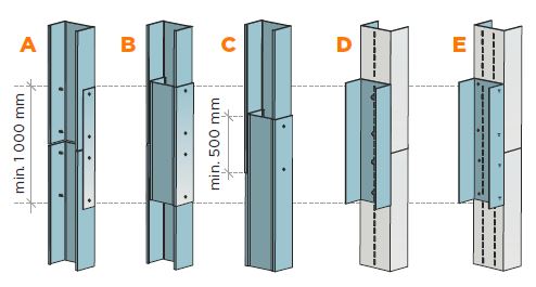 Napojení profilů UA se provádí pomocí příložky z profilu UA délky min. 1 000 mm. Délka příložky se rovnoměrně rozdělí na obě strany styku a přišroubuje na spojované části UA profilů stojinami k sobě pomocí 4 kusů šroubů M8 s matkou a podložkou (obr. D) nebo pomocí 8 kusů samovrtných šroubů LB 4,2 x 13 mm (obr. E). Napojení na sousedících stojinách nesmí být ve stejné výši. Je nutno je vzájemně výškově vystřídat minimálně o 2 metry. Napojení je vhodné orientovat blíže k hornímu nebo spodnímu okraji příčky.