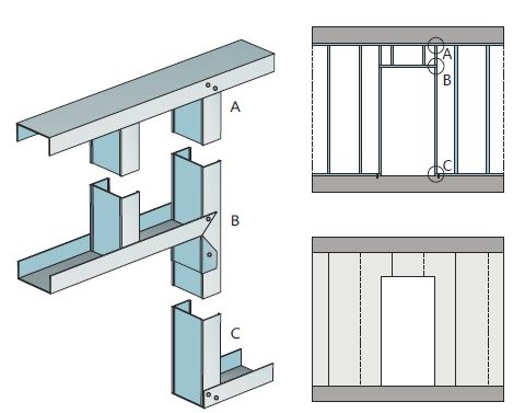 Profily R-CW přiléhající k zárubni se spojí s podlahovým i stropním R-UW profilem pomocí dvojic prostřihů, nýtů nebo samořezných šroubů typu 421 LB. Tyto svislé profily se po celé délce vyztuží profilem R-UW, který je nasunutý z vnější strany (tzv. skříňový nosník – viz obrázek). Nad dveřním otvorem se zabuduje překlad (výměna) z profilu R-UW.
