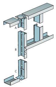 Profily R-CW přiléhající k zárubni se spojí s podlahovým i stropním R-UW profilem pomocí dvojic prostřihů, nýtů nebo samořezných šroubů typu 421 LB.