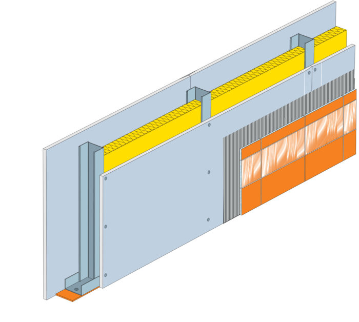 Instalační stěny jsou opláštěny z obou stran dvěma vrstvami impregnovaných sádrokartonových desek.