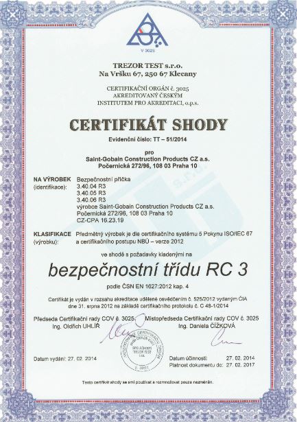 Konstrukce jsou certifikovány na bezpečnost proti protlačení a násilnému vniknutí a jsou ve shodě s požadavky kladenými na bezpečnostní třídu RC 2, RC 3 a RC 4 podle ČSN EN 1627.