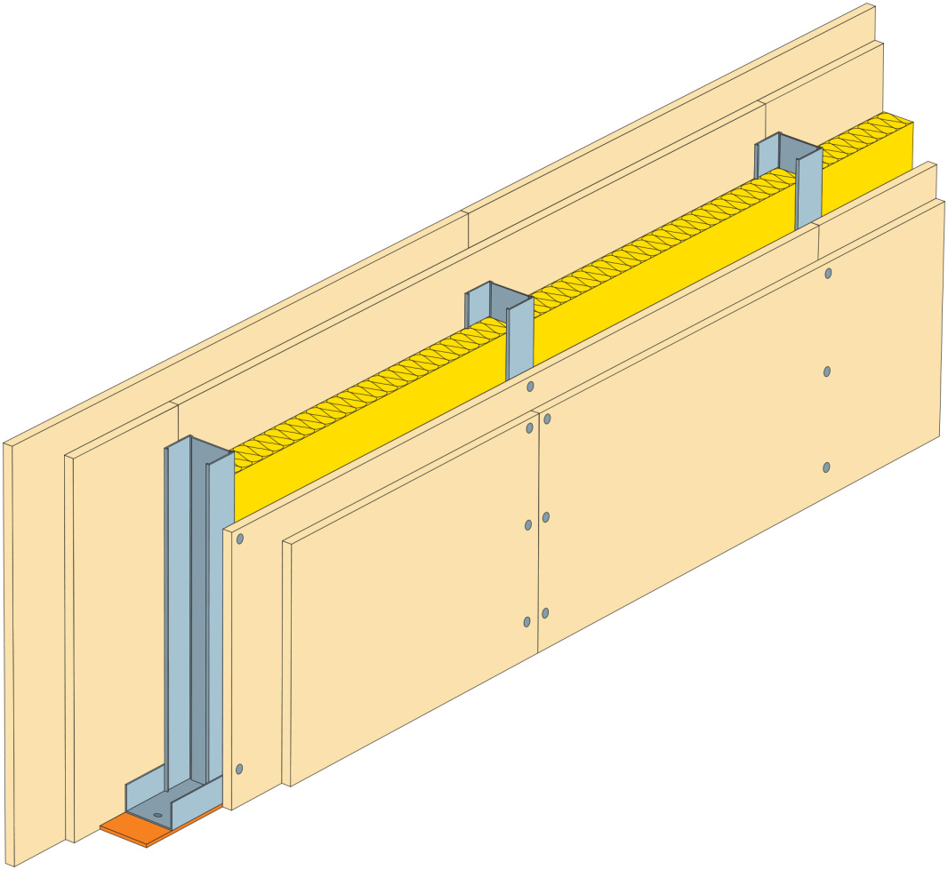 Spřažení se provádí propojovacími příložkami z impregnovaných sádrokartonových desek. Výška příložky je rovna šířce dutiny příčky, nejméně však 300 mm. Tyto příložky jsou umístěny ve třetinách výšky konstrukce. Do obou vzájemně spřažených profilů R-CW jsou připevněny nejméně třemi šrouby.