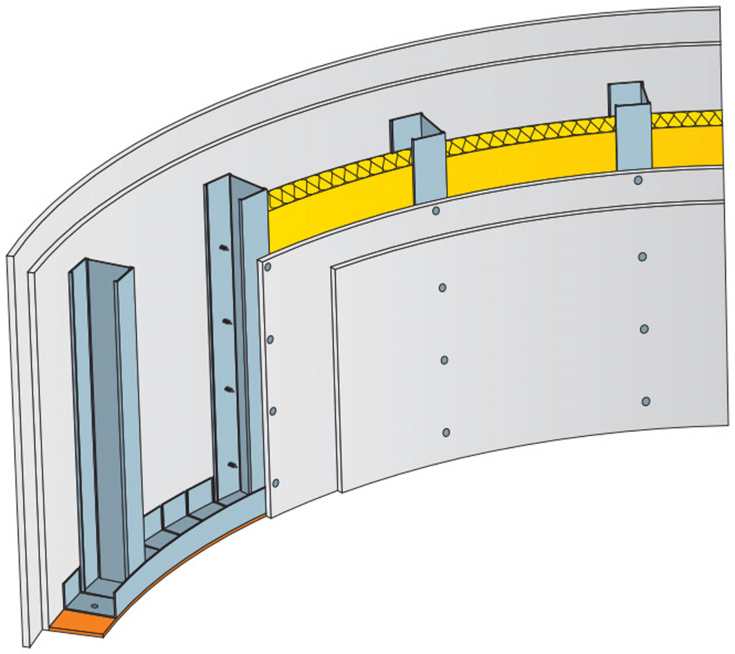 Obloukové stěny se montují ze standardních součástí, opláštěny jsou speciálními, za sucha tvarovatelnými deskami Glasroc F Riflex (Multiboard).