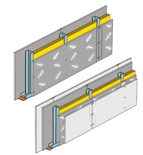 Při dvojitém opláštění mohou být oba pláště alternativně tloušťky 12,5 nebo 10 mm. Spáry podkladního pláště lze tmelit, lepit či montovat nasucho na těsný sraz.