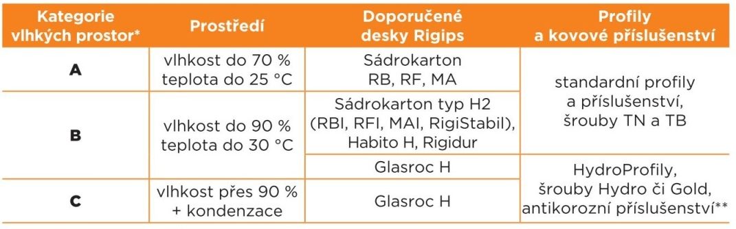 | Kategorie vlhkých prostor * | Prostředí | Doporučené desky Rigips | Profily a kovové příslušenství |