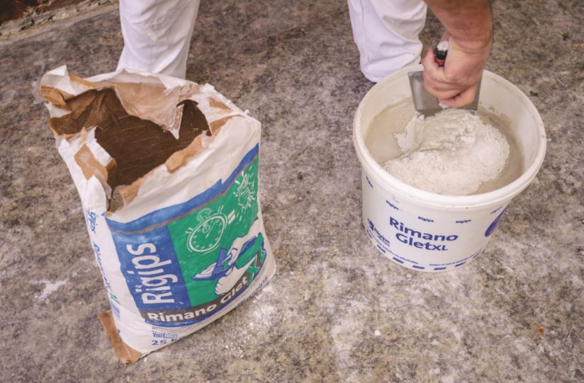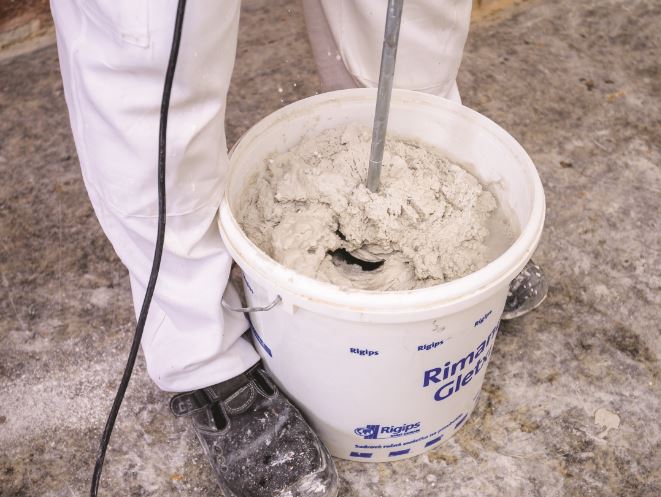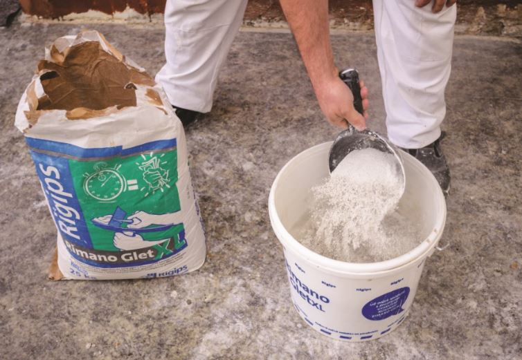 Do čisté nádoby s čistou vodou pomalu sypeme směs sádry. Sádrové omítky můžeme sypat pomalu přímo z obalu nebo přes hranu lžíce či fanky do čisté vody. Stěrky raději prosypáváme mezi prsty. Zkrátíme si tak dobu míchání a zabráníme vzniku hrudek.