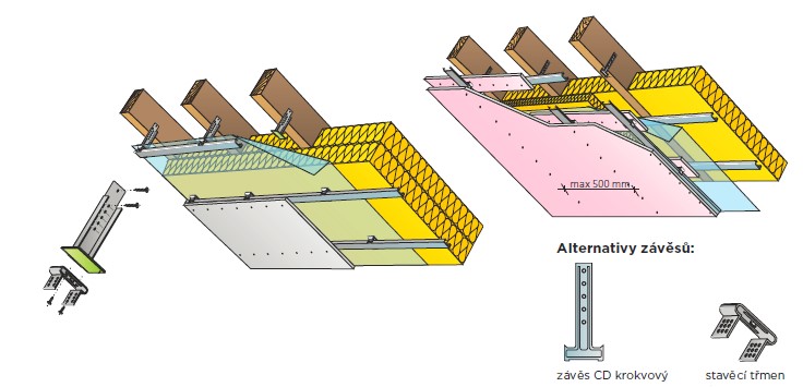 - kovové tenkostěnné pozinkované profily R-CD a R-UD (lze je nahradit profily HUT) nebo dřevěné latě ≥ 50/30 mm