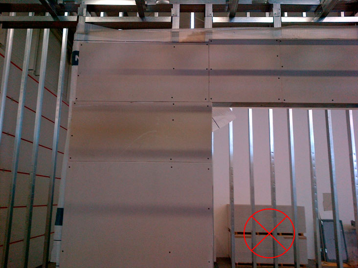 - Při montáži opláštění se desky orientují vždy na výšku ke svislým CW profilům. Používání zbytků desek na opláštění příčky je možné, ale je nutné dodržet minimální šířku přířezu, aby nedošlo k narušení celistvosti konstrukce. Používá se přířez s minimální šíří 400 mm a neměly by být dva přířezy vedle sebe ani nad sebou, aby nedocházelo ke vzniku křížových spár.